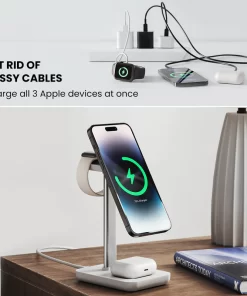 - Charges all 3 devices (iPhone 16/15/14/13/12; Apple Watch Series: 3-10, SE & Ultra 1/2; AirPods – Wireless Charging Models)at once- no extra cables required