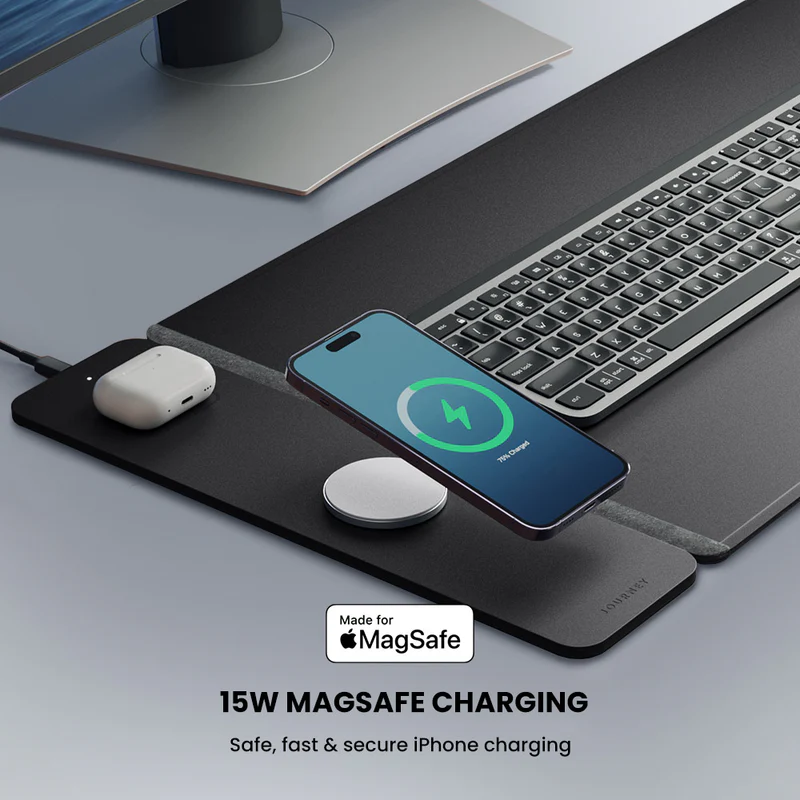 Experience the ultimate desk organization with our double-sided desk mat ALTI ULTRA. One side boasts a luxurious vegan leather surface, while the other offers soft felt. In between, you’ll find a concealed document hideaway zone. Plus, it’s equipped with a 15W MagSafe charging pad for your iPhone and wireless charging for your AirPods. Stay stylish and organized with this all-in-one desk mat.